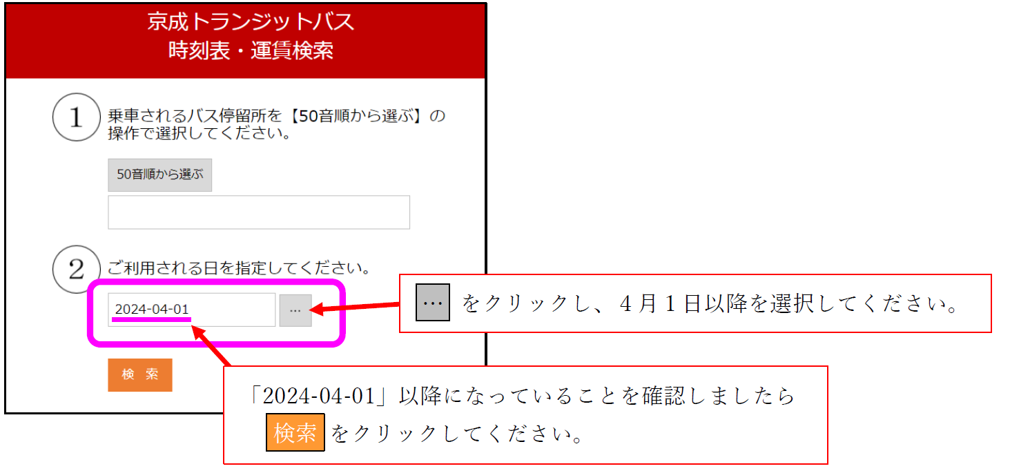 ※検索時はお手数ですが、②ご利用される日を2024年4月1日以降に設定して検索をお願いいたします。