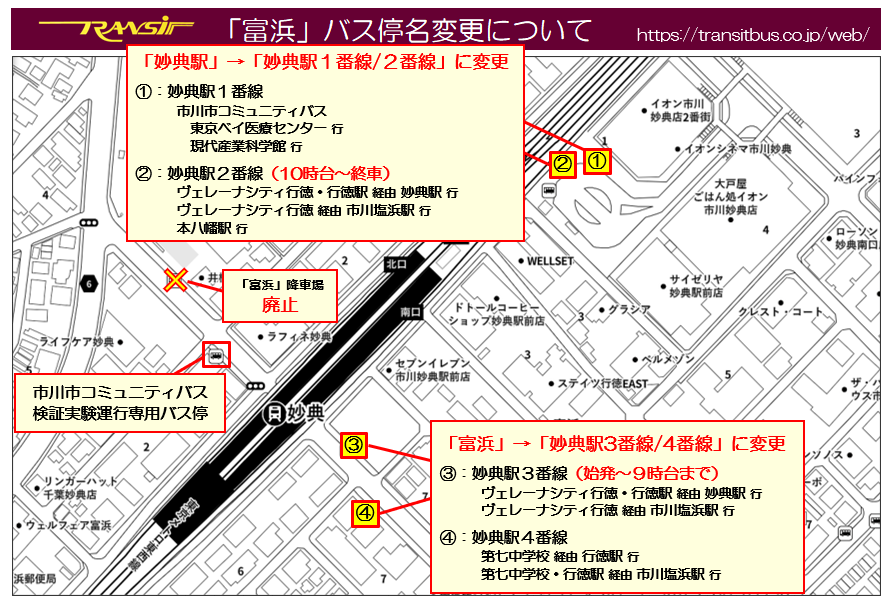 終着地を行徳駅として、終日妙典駅4番バス停を経由する循環運行へ変更いたします。