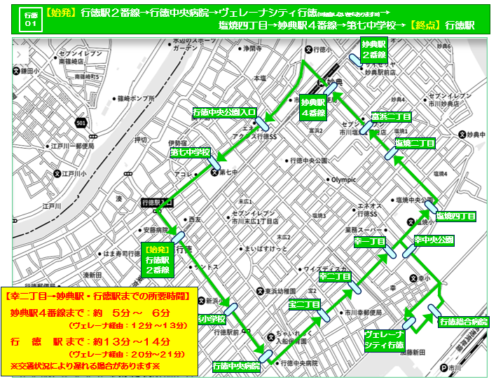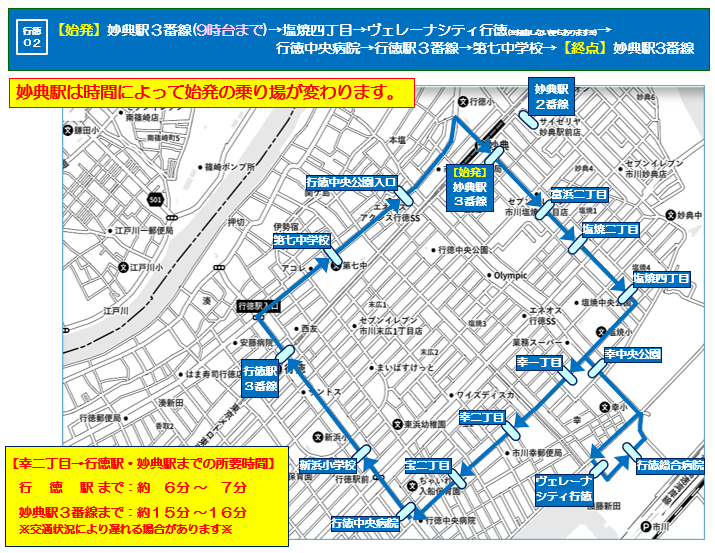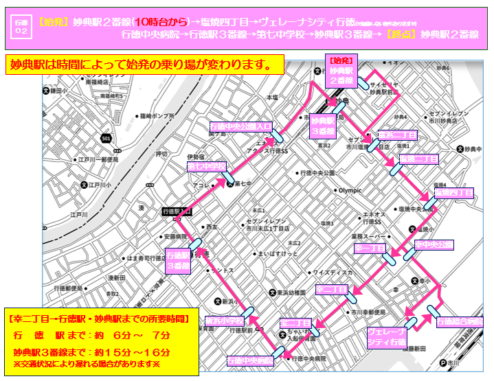 行徳01系統(内回り)、行徳02系統(外回り)とも、「行徳駅」「妙典駅」に停車いたします。