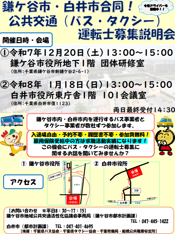 鎌ケ谷市・白井市合同バス運転士募集説明会のお知らせ